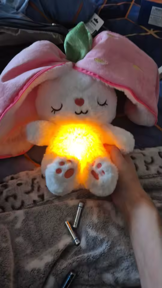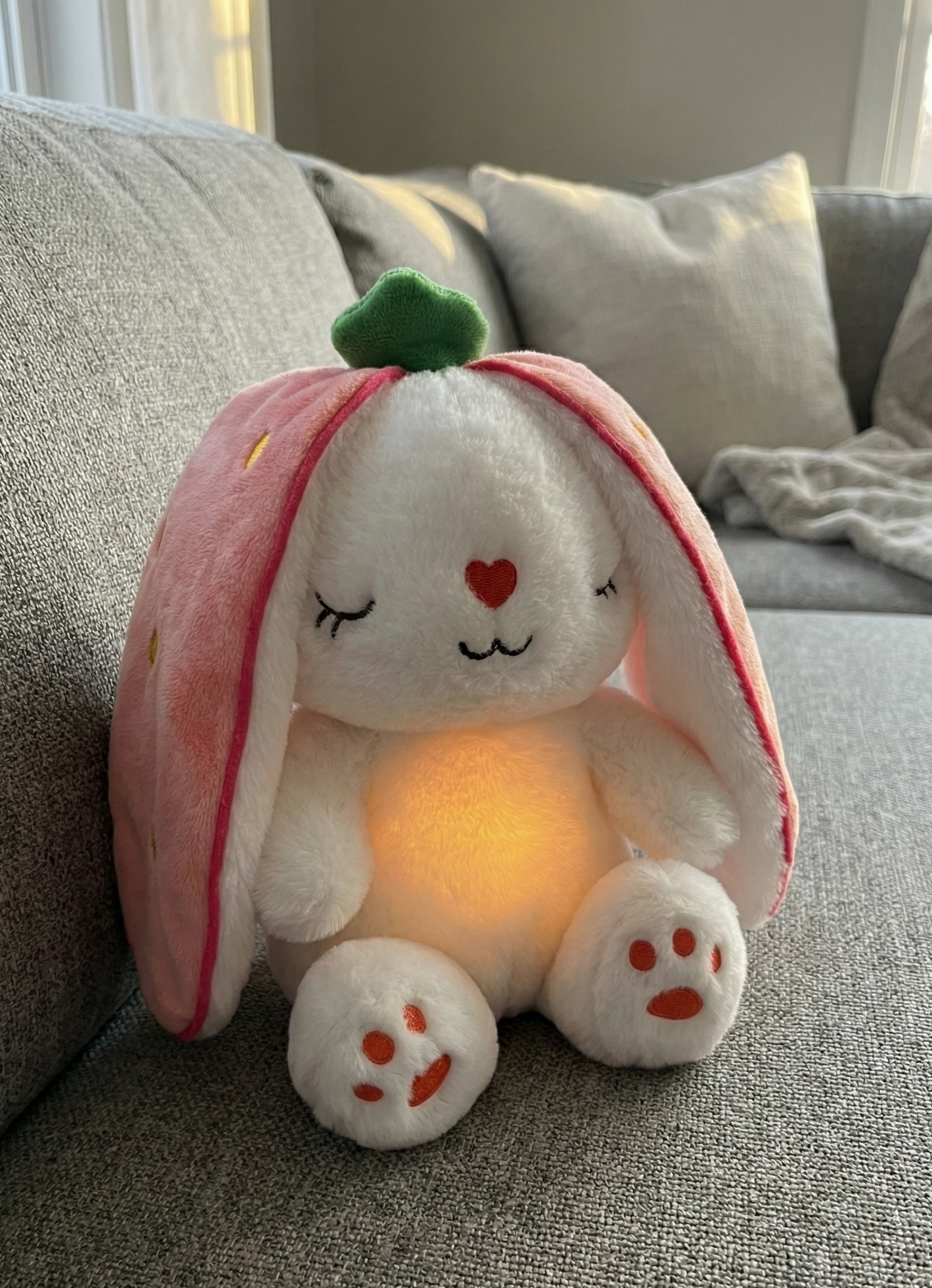 Compré primero el de fresa para mi hijo pero me puse celosa por que me encantan los peluches, así que pedí el de zanahoria. ¡Se ven hermosos juntos! Y sin hablar de lo relajante que es su respiración y la luz tenue que tiene. Muy contenta.